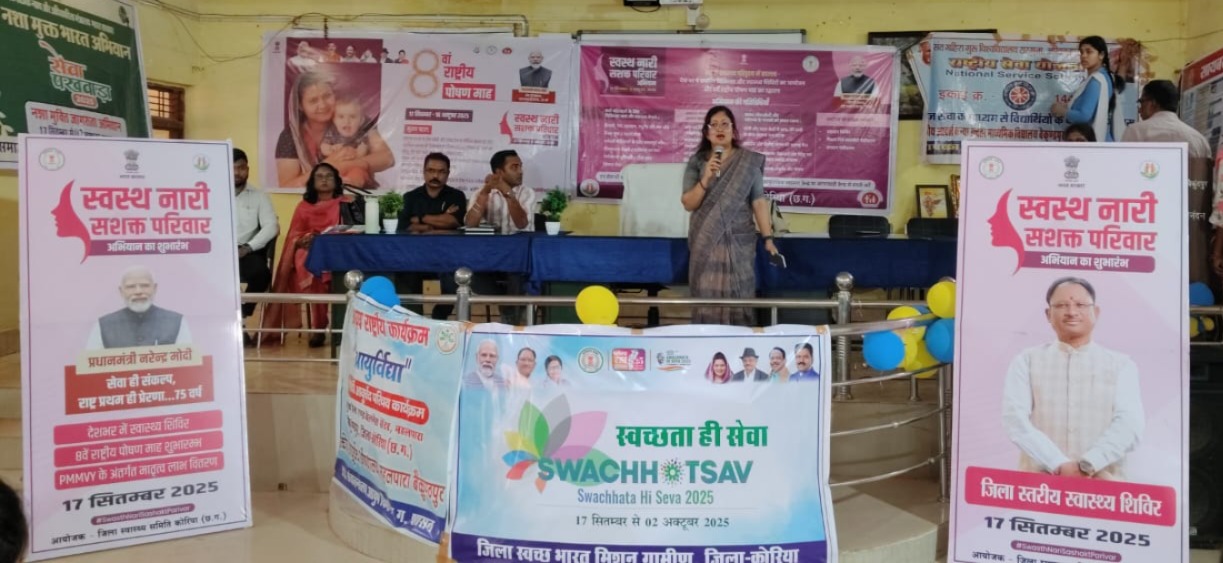 कोरिया जिले में स्वस्थ नारी-सशक्त परिवार अभियान के अंतर्गत आज विशेष जागरूकता कार्यक्रम आयोजित किया गया। कार्यक्रम कलेक्टर श्रीमती चंदन त्रिपाठी के निर्देशन और मुख्य चिकित्सा एवं स्वास्थ्य अधिकारी डॉ. प्रशांत सिंह के मार्गदर्शन में संचालित हुआ।